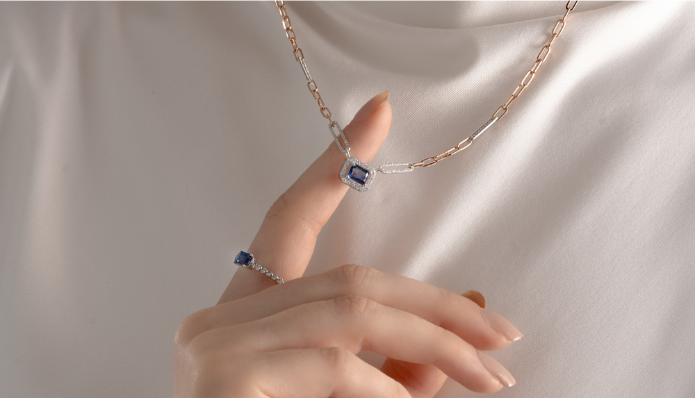 Radiant sapphire gemstone set against dark, polished 18K white gold and rose gold, adorned with diamonds capture the intensity of an eclipse, where light and shadow meet to create something breathtakingly beautiful.