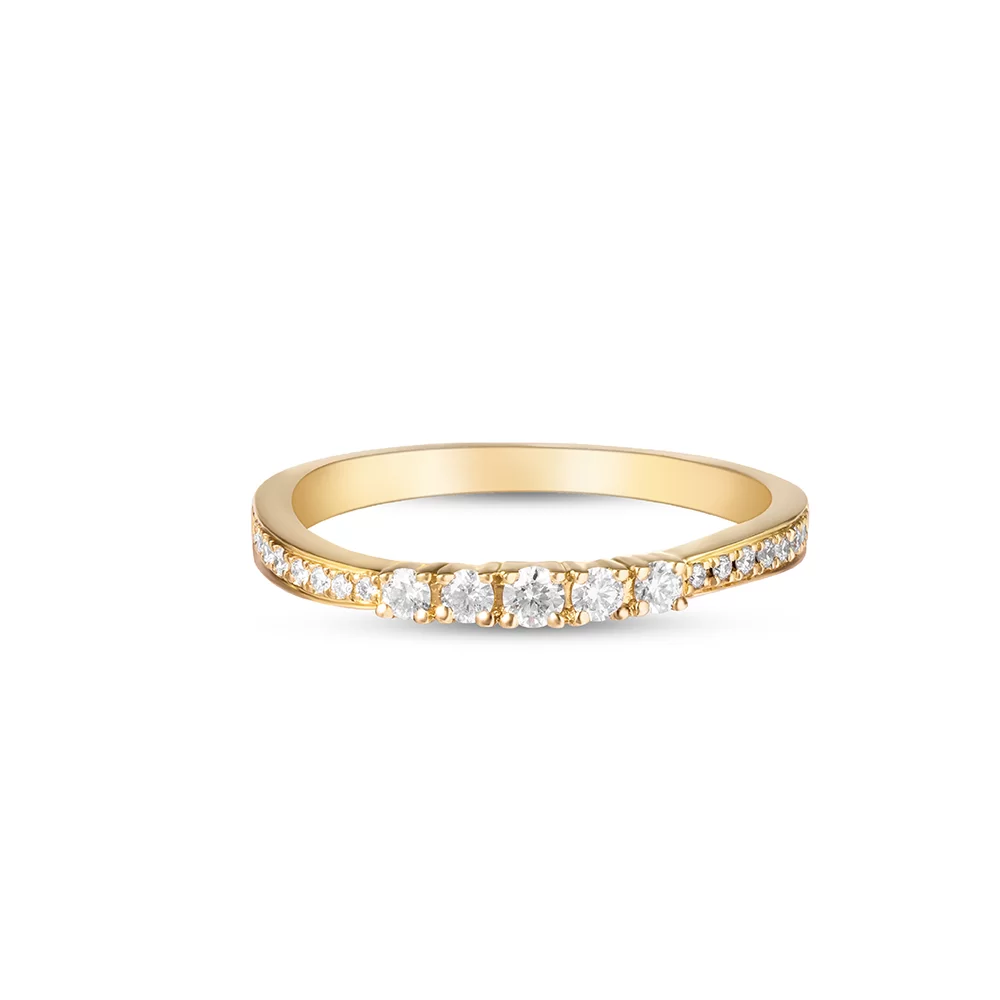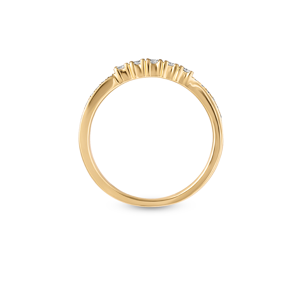 A striking yellow gold ring with five central diamonds, accentuated by shimmering melee diamonds, symbolizing endless beauty and grace.