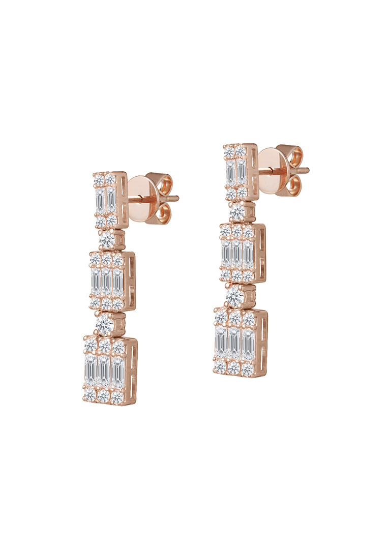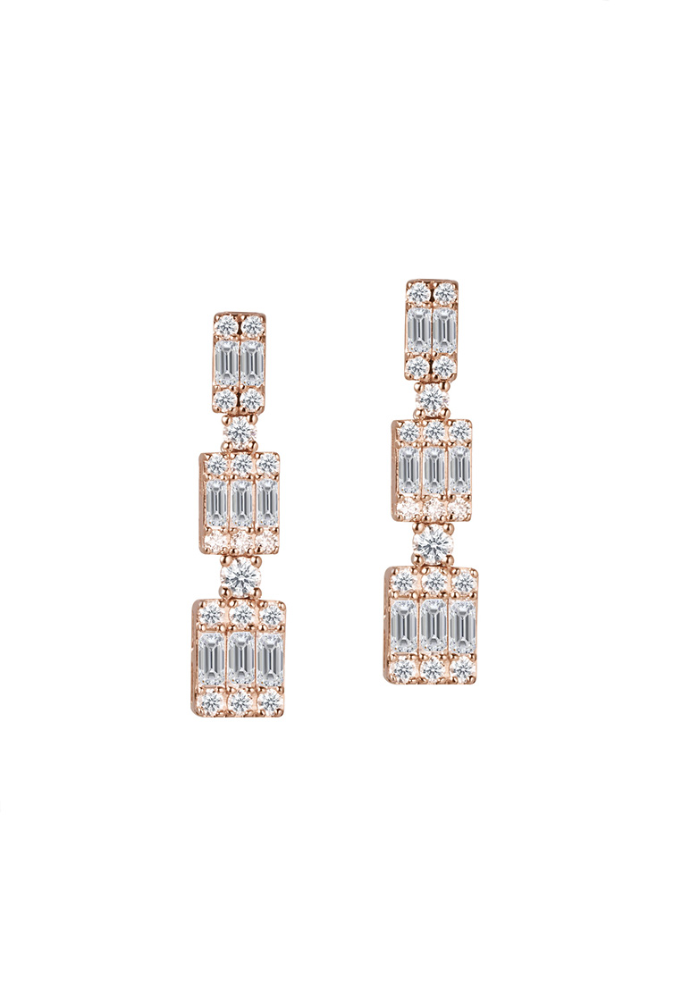 Jewelry that speaks volumes. The Ethereal Elegance earrings, featuring emerald-cut diamond designs and crafted in 18k rose gold, exude chic sophistication and romantic charm.